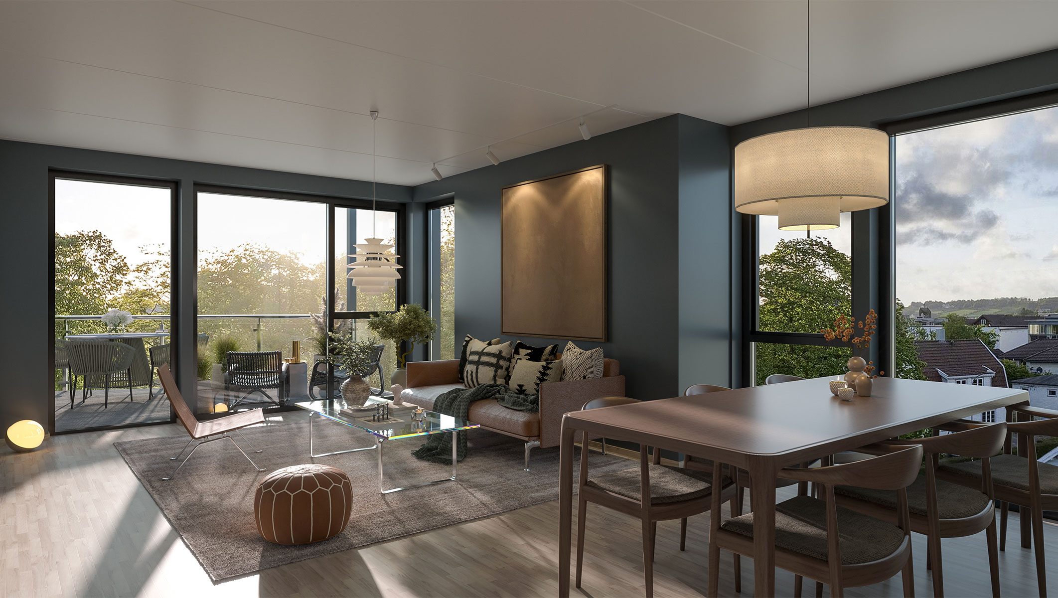 Reier Carlsen Arkitekter er kjent for å tenke helhet – både i form, funksjon og materialbruk. På Solhaug har de skapt leiligheter som oppleves like praktiske som vakre. Det er ikke bare arealene som er store – det er også takhøyden, lyset, utsikten og følelsen av ro. Materialvalg og detaljer holder en standard som tilfredsstiller selv de mest kresne: enstavs eikeparkett på toppene og trestavs eikeparkett i de andre etasjene, listfrie overganger, gjennomgående farger og kvalitetskjøkken med integrerte løsninger.